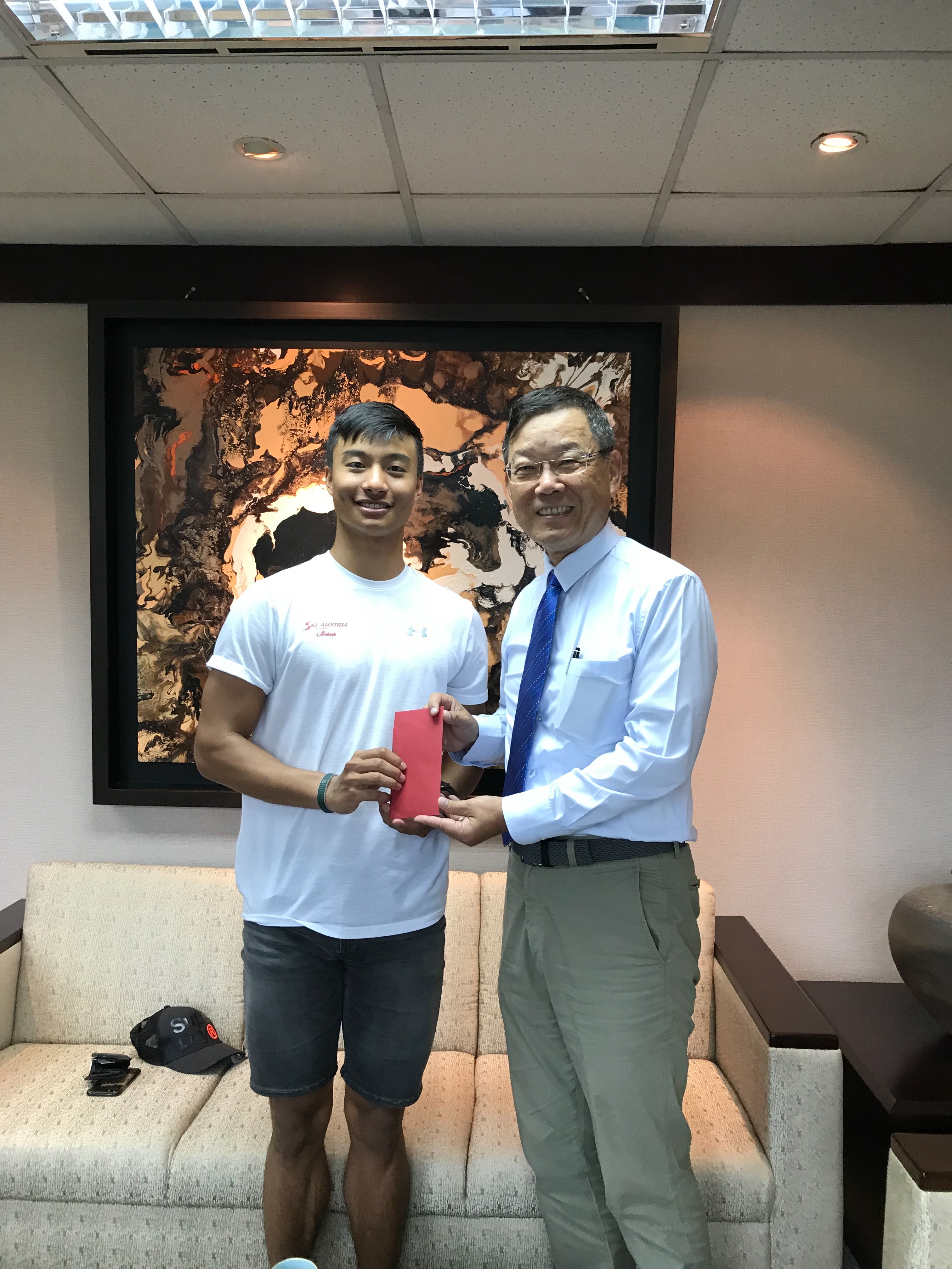林理事長頒發獎金給奧運儲備選手何秉睿,恭賀他考取奧地利滑雪指導員資格