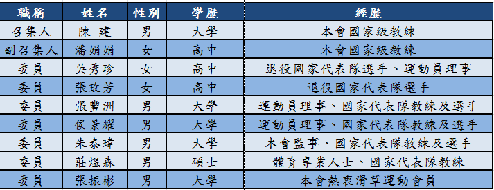 (一)置委員7至9人,其中1人為召集人,1人為副召集人,由理事長推薦,並經理事會通過,報教育部體育署備查後聘任之。