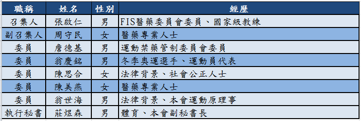 (二)本委員會委員須包括至少1名為中華奧會運動禁藥管制委員會委員,以及法律、體育、醫學/醫藥專業人員。