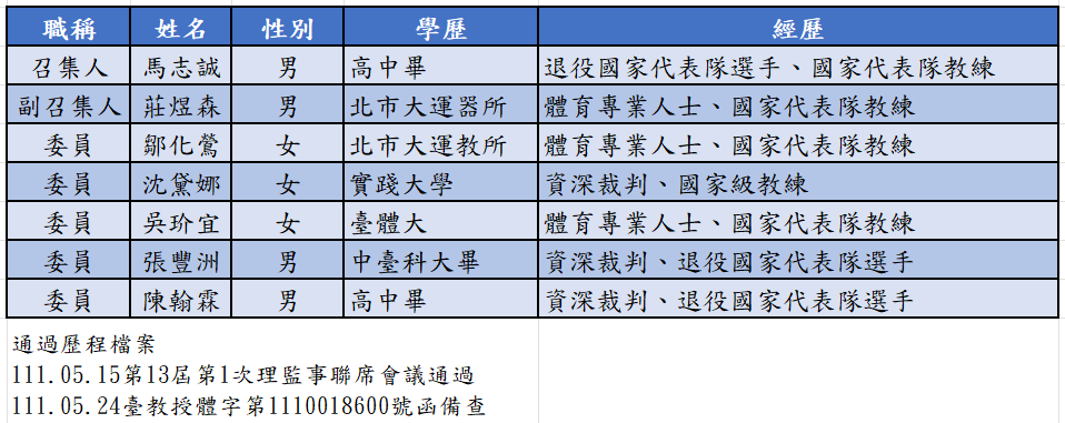 (一)置委員7至9人,其中1人為召集人1人為副召集人,由理事長推薦,並經理事會通過,報體育署備查後聘任之。